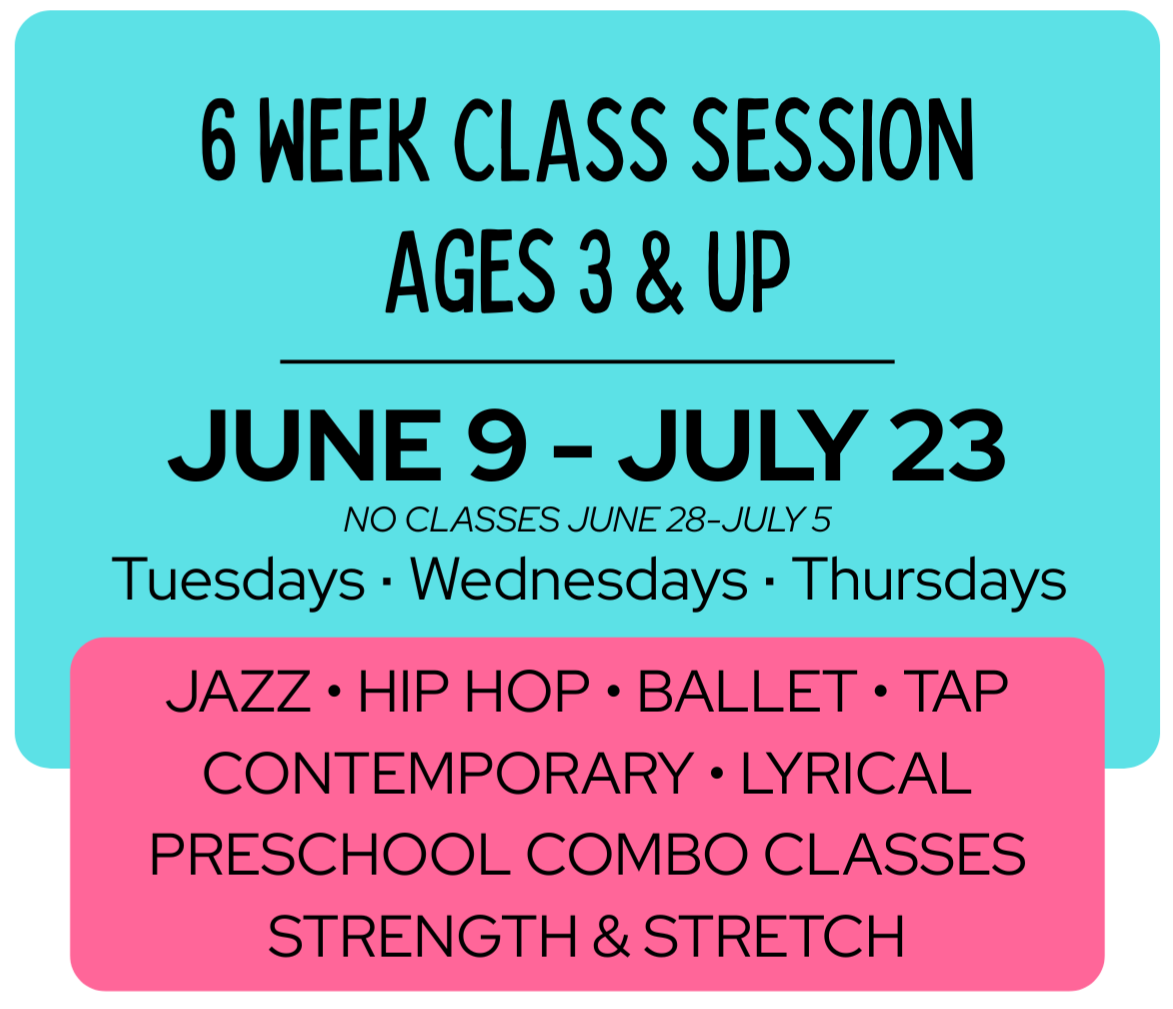 Classes meet Once per Week for Six Weeks. A few Advanced Level Classes will only meet for 3 Weeks in July as our Company dancers will be using that time in June to rehearse for their Nationals Competition Trip this summer. This is noted on the Schedule below next to the teacher’s name.